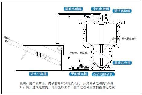 由于葉輪葉漿向上傾斜,旋轉(zhuǎn)時(shí)將使池中的污水呈螺旋狀加速,形成渦流態(tài),產(chǎn)生留心力。同時(shí)池內(nèi)污水流在葉輪葉片攪拌剪切力的作用下,互相剝離,依靠砂的自身重力和旋流的離心力,使砂粒沿池壁呈螺旋線加速沉降,向中心砂斗積聚,經(jīng)氣提或泵提升后排出池外作進(jìn)一步的處理。在此過程中,適當(dāng)?shù)臉~角度和線速度條件,使污水中的砂粒受到?jīng)_刷,并保持好的沉降效果,而原來粘附在砂粒上的有機(jī)物,以及重量小的物質(zhì),隨污水一同流出旋流沉砂池,進(jìn)入后續(xù)工序繼續(xù)處理,砂與少量污水進(jìn)入池外砂水分離器內(nèi),砂經(jīng)分離后外排,污水回流至格柵井。